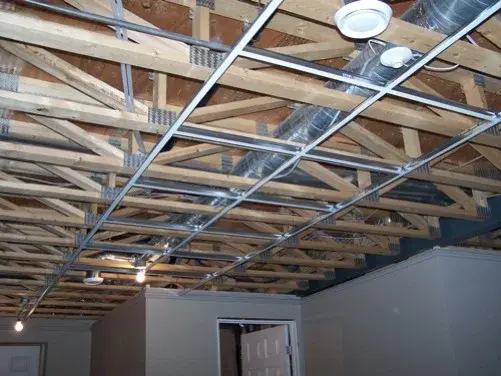 The metal framework of dropped ceilings consist of long metal strips, called “mains,” which are interconnected with shorter metal pieces known as “tees.” The main components of a grid system are the 12’ main runner, the 4’ cross-tee, the 2’ cross-tee and the 12’ wall angle. The ceiling tiles are attached to these ties forming a false ceiling below the original one.